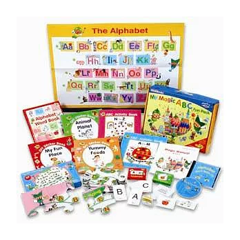 有聲字母書1本、CD 1片、字母歌謠海報1張、字母歌謠拼圖1張、有聲遊戲本2本、有聲遊戲撲克牌2副(含字母卡52張、單字圖卡52張)、有聲主題貼紙簿3本(含貼紙300張)、卡匣1個、秘笈小書1本(含使用說明、玩法介紹等)