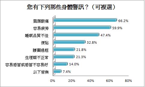 根據調查顯示,僅有兩成女性自認為身體健康,有六成女性則表示不了解自己身體健康情況是好還是壞,但卻有九成三明確知道自己身體出現毛病!這代表了許多女性雖然知道身體出現問題,但是卻不了解為什麼,長期下來很容易因為忽視而導致「早衰」!對於愛美的女性而言,這可是最大的致命傷!