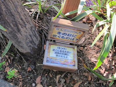 到了報到會場,工作人員會發給你一份暗號圖,內含四個寶箱的秘密位置與暗號,參加者必須以主辦單位給的名古屋市古地圖為線索,推理出寶箱位在哪個位置......像上圖的寶箱一,很明顯就是在長者町和外崛轉角處的神社,對照地圖上的位置就是"那古野神社",是名古屋相當古老的神社之一;透過這個方式,主要也是希望讓大家了解名古屋的歷史與人文,可以說寓教於樂結合得相當成功。下圖是那古野神社的風景與寶箱謎題,每個寶箱都不大,藏在某個特定的地點,你必須解開上面的謎題然後將謎底的假名寫下,在暗號圖上就可以重組成另外一個字,最後將這個字交給主辦單位你就可以拿到"寶物"了。