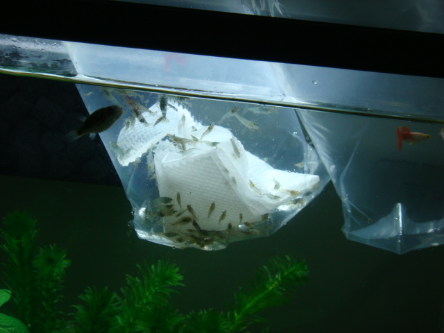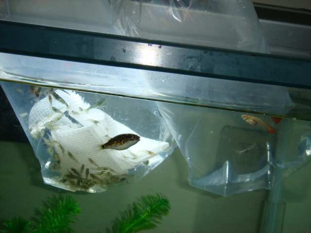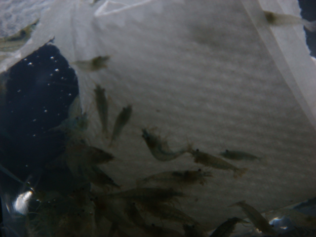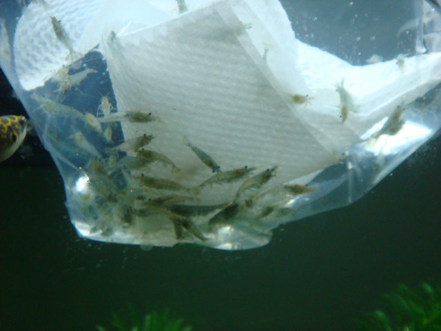 不要馬上丟入魚缸,要先用蝦子適應水溫。