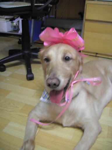 把多多打扮成一個大禮物,真是有夠節能減碳,而且多多很愛他的新彩色鈴鐺。