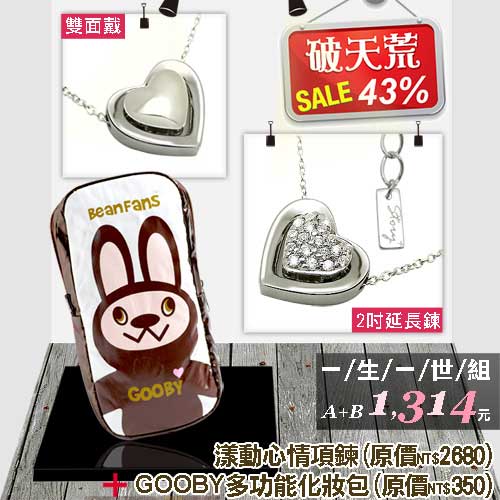 - 浪漫真心項鍊 (原價$ 1,680)+GOOPY精巧化妝包 (原價$ 265) = NT$ 1.945 下殺5折