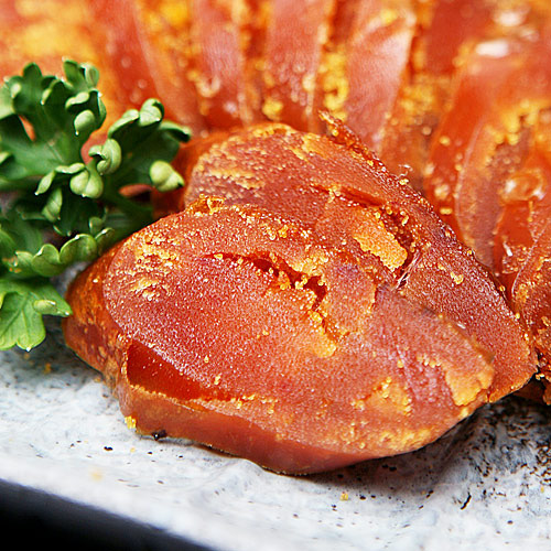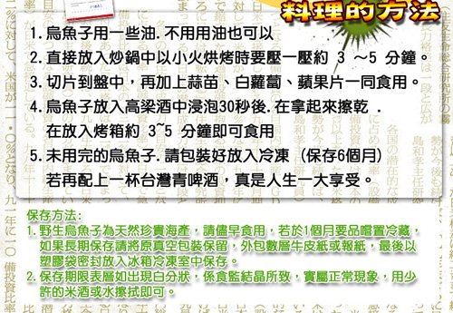 野生烏魚子為天然珍貴海產,請儘早食用,若於1個月要品嚐置冷藏,如果長期保存請將原真空包裝保留,外包數層牛皮紙或報紙,最後以塑膠袋密封放入冰箱冷凍室中保存。