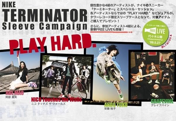 NIKE NSW 選用了色彩上更能做變化的 TERMINATOR,與日本 Tower Record 挑選了四組極具個人特色的歌手及團體展開了所謂"PLAY HARD"的企劃。除了配合NIKE 的形象拍攝外,也針對每組歌手團體設計了限定的CD封面,5月27 於代代木公園將會舉辦名為"FREE LIVE" 的小型演唱會,雖然此類與異業結合的行銷手法是日本方面的強項,但我還是不免想說......這感覺真的太酷了!