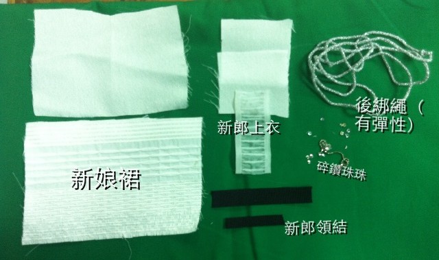 <h4 style="font-family:'Times New Roman';font-size:medium;line-height:normal;text-align:center;">新娘杯套~大致成形囉~</h4><h4 style="font-family:'Times New Roman';font-size:medium;line-height:normal;text-align:center;">來囉~男生的模樣出來了</h4><h4 style="font-family:'Times New Roman';font-size:medium;line-height:normal;text-align:center;"> 對了對了~~~~</h4>背後用彈性繩綁請來 再縫起來~~~便可以~伸縮自如了~