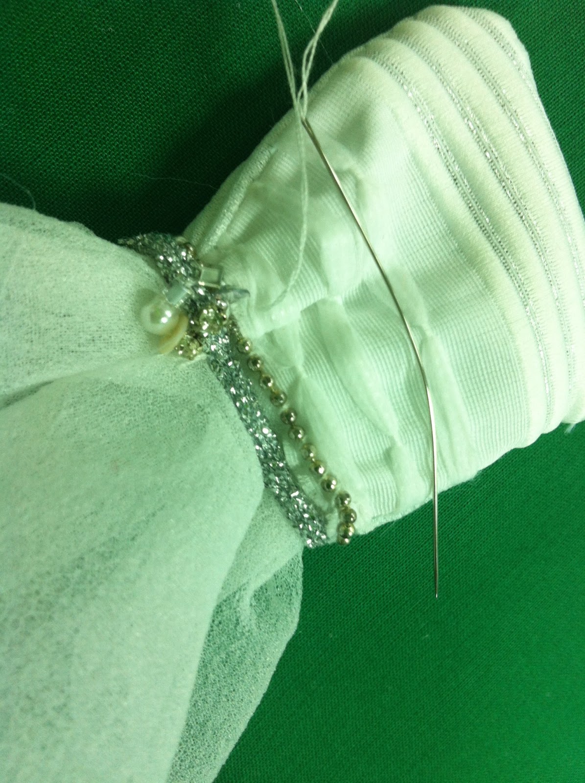將上衣和裙襬接起來 中間用珠珠亮片縫製點綴。
